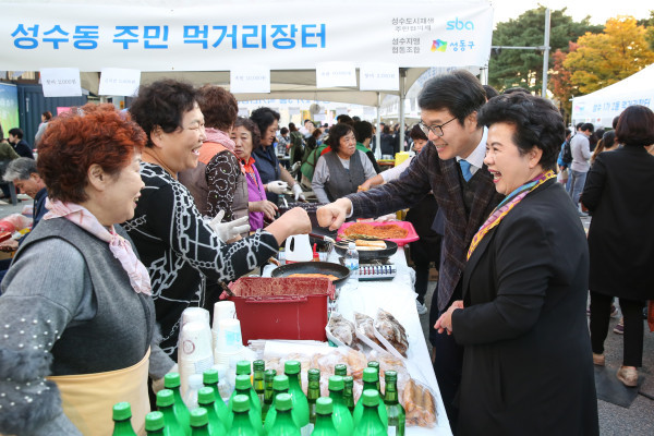 서울 성동구가 지난 20~21일 양일간 서울숲 공원과 언더스탠드에비뉴 일원에서 도시재생축제 ‘꽃길만 걸어요’를 개최했다. 사진은 행사부스 중 먹거리장터를 방문한 정원오 구청장이 상인들과 인사를 나누는 모습. (사진제공=성동구청)