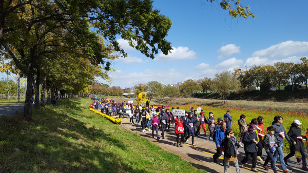 인천 연수구는 지난 27일 선학체육관 광장 및 승기천 일대에서 '제2회 승기천 환경사랑 걷기 대회'를 성황리에 개최했다. 걷기대회에는 고남석 구청장을 비롯한 지역 국회의원과 시의원, 구의원 등 구민 1500여명이 참가했다. 참가자들은 선학체육관 광장을 출발해 선학교를 거쳐 수인선 철교를 반환점으로 되돌아오는 승기천변 5㎞ 코스를 걸으며 승기천변의 가을 정취를 만끽했다. (사진제공=연수구청)