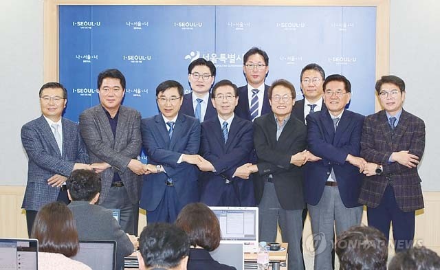 박원순 서울시장(가운데), 조희연 서울시교육감(오른쪽 세번째)과 참여 구청장들이 29일 서울시청에서 고교 등 친환경 무상급식 확대 정책에 대해 발표한 뒤 함께 손을 맞잡고 있다.