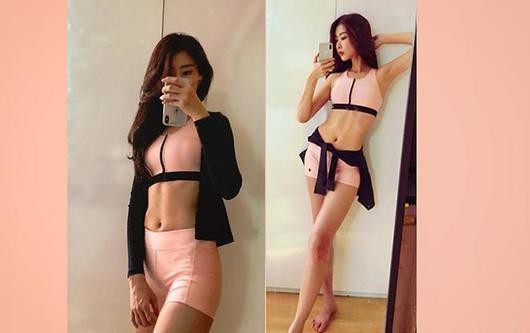 공개된 사진 속 김하림은 연분홍빛 수영복을 입은 채 거울 앞에서 포즈를 취하고 있다.