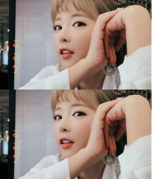 사진 속 홍진영은 자신이 설명한 대로 손을 얼굴에 대고 셀카를 찍었다. 홍진영은 밝은 표정을 짓고 있다.