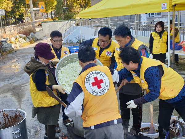 경기 남양주시 오남읍은 지난 27일 오남읍사무소 앞 주차장에서 대한적십자사 오남읍지회 ‘크낙새봉사회’와 ‘오남봉사회’의 회원들이 참석한 가운데 ‘모여 짜장면 데이(Day)’ 행사를 개최했다. 사진은 봉사자들이 짜장을 만들고 있는 모습. (사진제공=남양주시청)