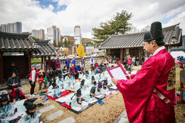 지난 27~28일 경기 심곡서원과 용인포은아트홀에서 조광조 선생의 숭고한 정신을 창작가무악을 통해 시민에게 널리 전파하기 위한 ‘제3회 정암문화제’가 개최됐다. 사진은 ‘성균관 유생 조광조, 과거급제하다’ 체험 프로그램의 진행 모습. (사진제공=용인시청)
