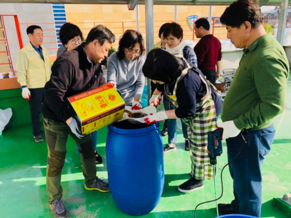 최근 서울 은평구 갈현2동주민자치위원회가 동주민센터 청사 옥상에서 주민자치위원, 직능단체원 등과 함께 주민자치사업 중 하나인 친환경 재생 비누 만들기 사업을 실시했다. 사진은 비누를 만들기 위해 폐식용유의 불순물을 걸러내고 있는 모습. (사진제공=은평구청)