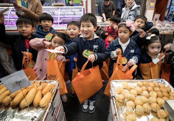 31일 오전 서울 광진구 중곡제일전통시장에서 열린 '전통시장 비닐봉투 FREE DAY' 행사에서 어린이집 원아들이 전통시장 장보기 체험을 하고 있다.
