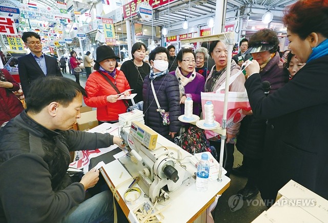 31일 오후 서울 강서구 화곡본동시장에서 열린 비닐봉지 줄이기 캠페인에서 시장을 방문한 시민들이 현수막으로 만든 쇼핑백을 받고 있다.