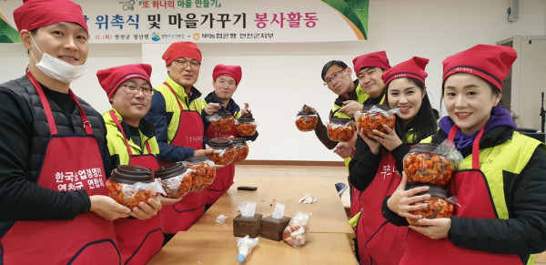경기 연천군 청산면 궁평2리 푸르내마을에서 NH농협은행 연천군지부 임직원 10여명이 참석한 가운데 무·배추 수확 일손돕기 및 마을주변 환경정화 활동이 진행됐다. 사진은 농협 관계자들이 활동 종료 후 기념촬영을 하는 모습. (사진제공=연천군청)