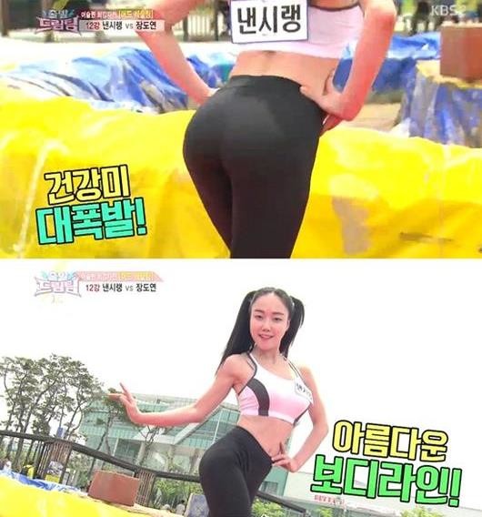 낸시랭은 과거 KBS2 예능프로그램 '출발드림팀 시즌2'의 '머슬퀸 최강자전쇼' 편에 출연했다. 이날 방송에서 낸시랭은 1라운드 머드 레슬링에서 장도연과 대결에 앞서 본인의 매력을 과시했다.