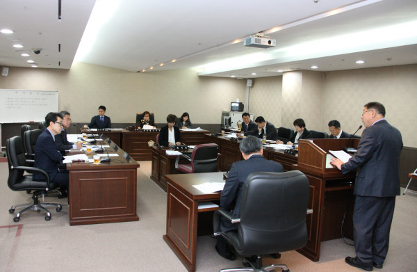 | ▲ 복지도시위원회 위원들이 ‘마포구 교복 지원 조례안’에 대한 제안설명을 듣고 있는 모습. (사진제공=마포구의회) | ||
