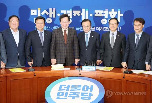 4일 오전 국회에서 열린 고위 당ㆍ정ㆍ청협의회에서 참석자들이 손을 맞잡고 있다. 왼쪽부터 더불어민주당 김태년 정책위의장, 윤호중 사무총장, 이낙연 국무총리, 이해찬 대표, 홍영표 원내대표, 장하성 청와대 정책실장.