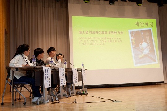 이날 주제를 발표한 정유정 학생은 청소년의 경제활동에 대한 인식 개선을 위해“청소년창업지원 방안”, 김가온 학생의 청소년 아르바이트 부당처우 개선을 위한“노동인권 교육강화 및 사업주 처벌강화”, 조민제 학생의 진로 도움을 위한“청진기 토크콘서트”, 최미혜 학생의 청소년의 자유로운 의견 제시를 위한“청소년 대상 청원사이트”개설을 각각 건의하였다.