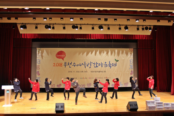 경기도농아인협회 부천시지회는 지난 3일 시청 어울마당에서 농아인과 가족, 자원봉사자 등 500여명이 참석한 가운데 ‘2018 부천수어사랑한마음축제’를 개최했다. 부천수어사랑한마음축제는 수어를 알려 수어와 농아인에 대한 사회적 관심을 유도하고 더불어 사는 사회를 만들기 위한 행사로 매년 개최되고 있다. 사진은 참여자들이 공연을 선보이는 모습. (사진제공=부천시청)