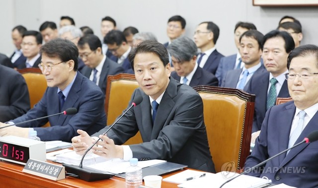 임종석 청와대 비서실장이 6일 국회에서 열린 국회 운영위원회의 청와대 국정감사에 참석해 의원 질의에 답하고 있다. 왼쪽부터 장하성 정책실장, 임실장, 정의용 국가안보실장.
