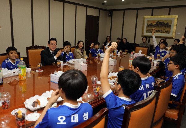 6일 정순균 강남구청장이 구청 회의실에서 강남구청장기 소년축구대회 우승팀인 ‘대치초’ 학생들을 만나 우승을 축하하고 학생들과 대화를 나누는 시간을 보냈다. 사진은 다과회를 열고 이야기를 나누고 있는 정 구청장의 모습. (사진제공=강남구청)