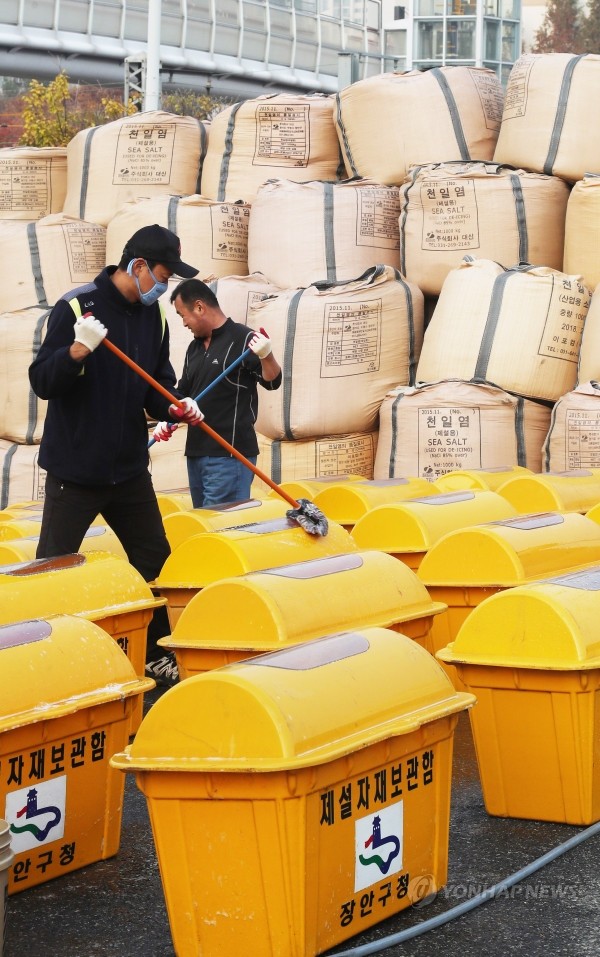 6일 오후 경기 수원시 장안구청 안전건설과 자재창고에서 직원들이 겨울에 사용할 제설함을 세척하고 있다.