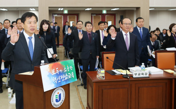 [무안=황승순 기자] 2018년도 전남도의회 교육위원회 행정사무감사가 7일 전남도교육청 대회의실에서 열린 가운데 장석웅 도교육감이 선서를 하고 있다.