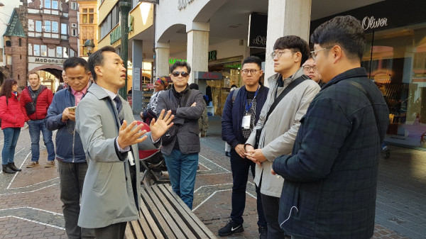 이항진 경기 여주시장을 비롯한 시청 공무원 등으로 구성된 교육참가단이 최근 독일 프라이부르크에서 3일간 진행된 ‘혁신아카데미’에 참석해 과정을 수료했다. 사진은 이 시장(왼쪽) 등 참가단원들이 독일 현지에서 도시재생과 관련해 현장토론을 하는 모습. (사진제공=여주시청)