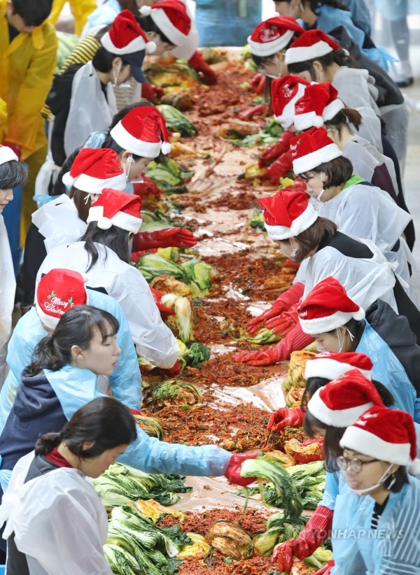8일 오전 서대문구 이화여대 생활환경관에서 열린 사랑의 김장 나누기 행사에서 산타클로스 모자를 쓴 참가자들이 김장을 하고 있다.