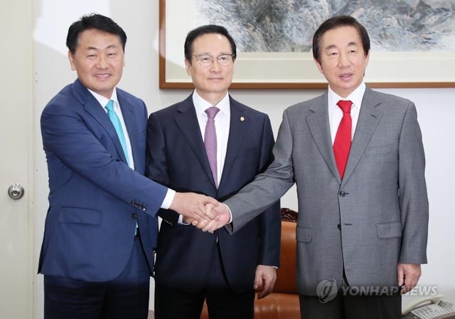 여야는 8일 박근혜정부 시절 국군기무사령부(기무사)의 계엄령 문건과 관련해 국회 국방위원회 차원의 청문회를 실시하기로 했다. 이날 오전 국회 운영위원장실에서 열린 현안논의 관련 교섭단체 원내대표 회동에서 바른미래당 김관영 원내대표, 더불어민주당 홍영표 원내대표, 자유한국당 김성태 원내대표(왼쪽부터)가 손을 잡고 있다.