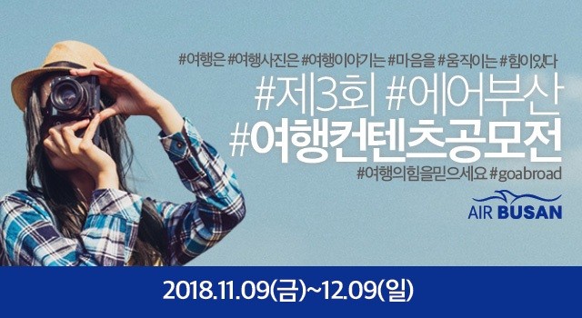| ▲ 에어부산 여행컨텐츠 공모전사진 지역항공사 에어부산(사장 한태근)이 ‘제3회 에어부산 여행컨텐츠 공모전’을 개최한다. 여행컨텐츠 공모전은 지난 2016년 첫 실시한 이후 올해로 3회째를 맞는다. 이번 공모전의 주제는 올해 에어부산이 진행하고 있는 ‘여행의 힘을 믿으세요 go abroad’ 캠페인과 연관 지어 여행을 통한 힐링, 가족 간 사랑, 친구 간 우정 또는 개인적 성장의 발견 등 ‘여행의 힘’을 느낄 수 있는 사진과 이야기다. 공모전은 개인 인스타그램 계정에 지정된 해시태그(#에어부산, #2018여행컨텐츠공모전)와 함께 업로드하면 자동으로 접수되는 방식이다. 컨텐츠 접수는 9일(금)부터 다음 달 9일(일)까지 한 달간 받으며, 심사를 거쳐 선정된 수상작들은 다음 달 26일(수) 경 공모전 인스타그램 계정을 통해 발표될 예정이다. 에어부산은 공모전 수상자와 참여자들에게 경품도 제공한다. 대상(1인) 국제선 왕복 항공권 2매, 최우수상(3인) 국제선 왕복 항공권 1매, 우수상(6인) 국내선 왕복 항공권 2매를 각각 제공한다. 또한 소문내기 이벤트 참여자들 중 30명을 추첨해 음료 교환권도 제공한다. 에어부산 관계자는 이번 당선작들로 ‘여행의 힘을 믿으세요’라는 캠페인 메시지를 주제로 한 단편 영상을 제작해 공식 인스타그램 계정에 업로드하고 광고 소재로도 활용할 계획이라고 전했다. 에어부산 여행컨텐츠 공모전에 대한 내용 및 자세한 접수 방법은 공모전 공식 인스타그램 계정(@airbusan2018)을 통해 확인할 수 있다. |