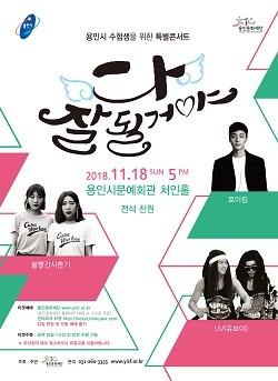 2019년도 대학수학능력시험을 치룬 수험생을 위해 (재)용인문화재단(이사장 백군기)은 용인시문예회관 처인홀에서 17일 <청소년문화충전소> 힙합콘서트, 18일 수험생을 위한 특별콘서트 <다 잘될거야>를 진행한다.