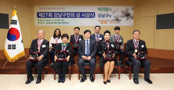 8일 오후 3시 서울 강남구청 3층 큰회의실에서 ‘제27회 강남구민의 상’ 시상식이 개최됐다. 사진은 구민대상 수상자 권은옥씨(앞줄 왼쪽 두 번째)외 7인의 수상자와 정유승 부구청장(앞줄 가운데)이 함께 기념촬영을 하고 있는 모습. (사진제공=강남구청)