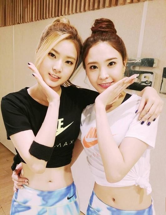 사진 속 두 멤버는 독특한 패턴의 스포츠 레깅스와 흑백 조화가 돋보이는 티셔츠를 입은 채 다정히 머리를 맞대고 있는 모습이다.