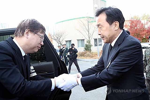 11일 부산 해운대구에 있는 부산 국군병원에서 열린 윤창호씨 영결식에 참석한 바른미래당 손학규 대표(오른쪽)에게 윤씨 아버지가 이른바 ‘윤창호법’ 통과를 호소하고 있다.