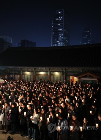 2019학년도 대학수학능력시험을 5일 앞둔 10일 오후 서울 강남구 봉은사에서 열린 수능 촛불기원법회에서 수험생과 학부모들이 촛불을 들고 있다.