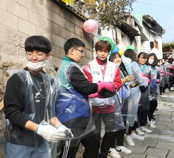 지난 10일 대한적십자사 서울시지사 청소년적십자(RCY·Red Cross Youth) 단원 350명이 홍보대사 가수 정세운씨와 함께 연탄 4000장과 쌀·라면을 서울시내 취약계층 20가구에 전달했다. 이날 봉사활동에 참여한 홍보대사 가수 정씨와 서울시내 중·고등학교 RCY 단원 350명은 이웃 사랑의 마음을 모아 열심히 연탄을 날랐다. (사진제공=대한적십자사 서울시지사)
