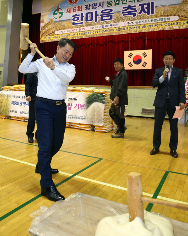 경기 광명시와 농촌지도자 광명시연합회는 지난 9일 광명시민체육관에서 ‘제6회 광명시 농업인의 날 기념 한마음 축제’를 개최했다. 이날 행사에는 농업인 등 400여명이 참석했다. 사진은 행사에 참여한 박승원 시장이 '떡메치기 체험'을 하고 있는 모습. (사진제공=광명시청)