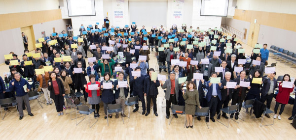최근 서울 은평구가 구청 은평홀에서 워크숍을 열고, 지역사회보장협의체 성과보고와 추진 과정, 비전, 목표, 추진전략, 핵심과제를 공유하고, 세부사업에 대한 의견을 나눴다. 사진은 워크숍 참가자들이 기념촬영을 하고 있는 모습. (사진제공=은평구청)