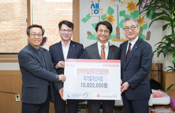 인천 서구 한국중부발전(주) 인천발전본부는 최근 질소산화물 배출권거래 수익금 1002만원을 서구 성문노인복지센터에 전달했다. 전달된 기부금은 성문노인복지센터 에너지 지원을 위한 태양광설치비로 사용 예정이다. 사진은 기부금 전달후 기념촬영을 하고 있는 관계자들의 모습. (사진제공=인천 서구청)