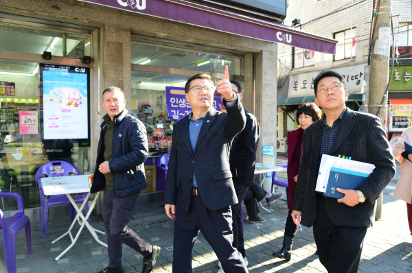 중랑구는 12일 오후 인근 상인 및 주민 약 40여명이 참석한 가운데 지역상권 활성화를 주제로 상봉동 먹자골목에서 중랑마실을 개최했다. 사진은 류경기 구청장(가운데)이 관계부서 국·과장들과 함께 상봉동 먹자골목 현장을 구석구석 둘러보고 있는 모습. (사진제공=중랑구청)