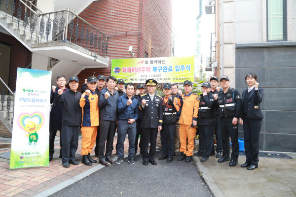 영등포소방서는 최근 화재로 피해 입은 가구에 대해 폐기물 처리 및 청소, 주택 수리 등 피해복구를 완료하고 '화재 피해주택 복구완료 입주식'을 진행했다. 사진은 서순탁 서장과 소방대원들이 복구완료 입주식을 기념해 기념 촬영한 모습. (사진제공=영등포소방서)