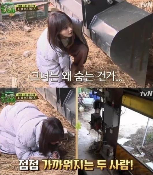 이날 방송에서 추수를 위해 한태웅의 집에 가장 먼저 도착한 송하윤은 현관문 안으로 들어가지 않고 소들이 있는 축사로 향했다. 이어 송하윤은 소들에게 말을 걸면서 조심스레 몸을 숨겼다.