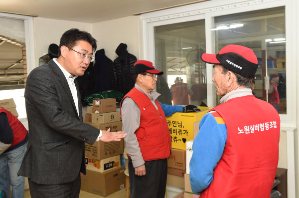 오승록 노원구청장이 13일 상계동 주공아파트 14단지 경로당에서 운영하고 있는 '어르신 실버택배' 현장을 방문했다. 실버택배는 우체국, CJ 대한통운과 업무협약을 체결해 상계동 주공아파트 12~14단지에 택배를 배달함으로써 노인들에게 일자리를 제공하는 사업이다. 사진은 오 구청장이 노인들과 이야기를 나누는 모습. (사진제공=노원구청)
