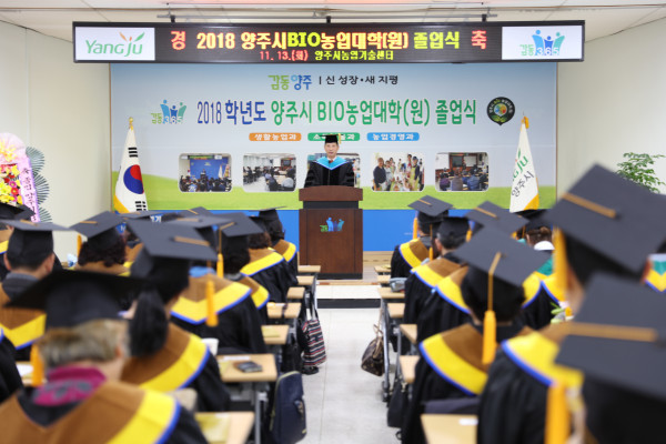 경기 양주시는 13일 양주시농업기술센터 대강당에서 '제13기 양주시 BIO농업대학'과 '제8기 BIO농업대학원' 졸업식을 개최했다. 이날 졸업식에는 졸업생과 가족 등 100여명이 참석해 지난 4월4일 입학식을 시작으로 총 30회에 걸쳐 120시간의 교육을 이수한 졸업생들을 축하했다. 사진은 시농업기술센터 소장이 축사를 하고 있는 모습. (사진제공=양주시청)