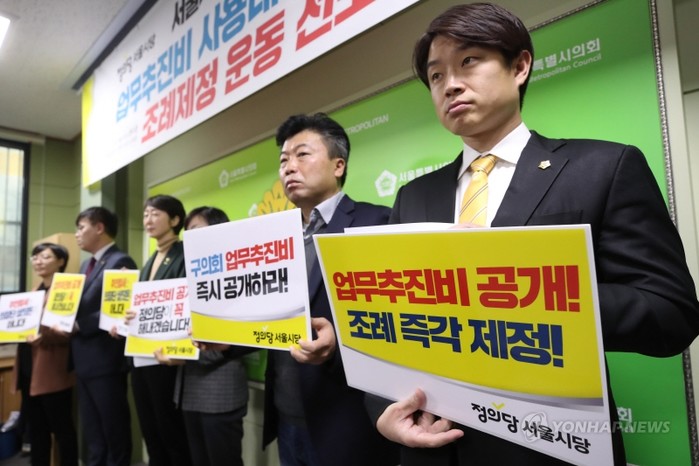 김종민 정의당 서울시당 위원장과 권수정 서울시의원을 비롯한 정의당 소속 구의회 의원들은 이날 서울시의회에서 기자회견을 열고 "업무추진비의 투명한 공개는 지방의회 투명성 회복의 첫걸음"이라며 "사실상 민주당이 독점하고 있는 서울시 25개 구의회 중 상당수가 업무추진비 사용내역을 공개하지 않고 있고 조례 제정도 반대하고 있다"고 주장했다.