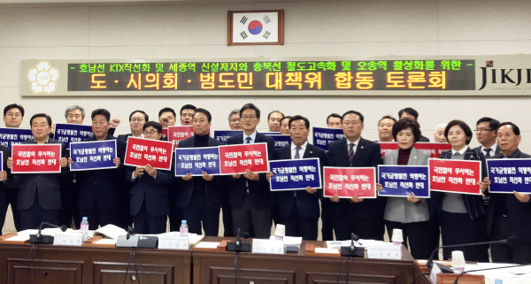 '충북도의회 충북선 철도 고속화사업 지원 및 KTX오송역 활성화를 위한 특별위원회'와 '청주시의회 KTX세종역 신설 반대 특별위원회', 'KTX세종역 신설 백지화를 위한 범도민비상대책위원회'는 14일 청주시의회 특별위원회 회의실에서 합동토론회를 열고 "호남선 KTX 직선화 및 세종역 신설을 백지화하라"는 내용의 공동성명서를 발표했다.