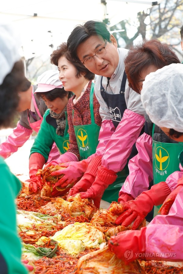 15일 오전 서울 송파구 서울놀이마당에서 열린 저소득 한부모 가족 지원 '2018 사랑과 나눔의 김장 담그기' 행사에서 박성수 송파구청장이 참석자들과 대화를 나누며 김장을 담그고 있다.