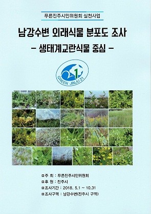 푸른진주시민위원회(위원장 김철호)는 지난 5월부터 10월까지 경남과학기술대학교 연구팀과 위원회 조사팀과 함께 남강수변 진주시구역(칠암,상평동)의 외래식물 분포도를 조사했다. 조사활동은 경남과기대 추갑철 교수와 김혜인, 이운자 학술연구원, 위원회의 윤태선, 주설희, 류충열, 주수현 위원을 중심으로 한 조사팀 등 10여명이 참가하여 외래식물 중 생태계교란식물을 중심으로 봄, 여름, 가을의 3차례에 걸쳐 조사활동을 전개하고, 활동에 대한 자료집을 발간했다.