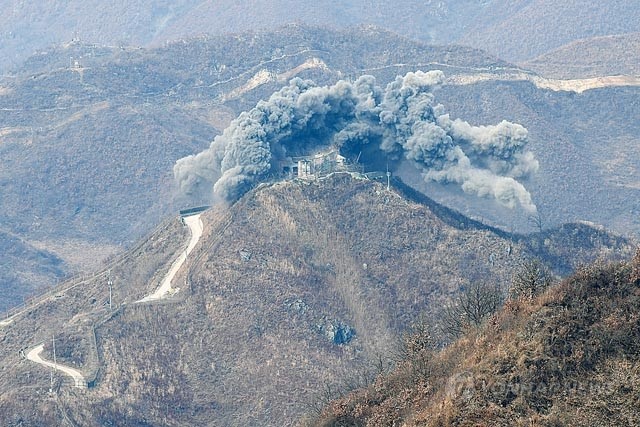 9.19 군사합의서에 따라 남북이 DMZ 내 GP(감시초소) 철거를 시작한 가운데 15일 군 당국이 폭파공법을 적용해 철원지역 중부전선에 있는 GP를 철거하고 있다.