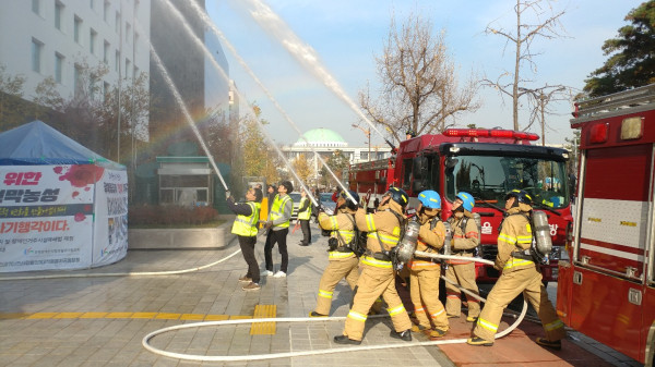 서울 영등포소방서는 최근 여의도 소재 이룸센터에서 재난취약계층 맞춤형 소방훈련을 실시했다. 이 훈련은 피난약자시설 재난발생 대비 대응태세 숙지를 위해 실시됐으며, 신고 및 초기 대응, 소방활동 등으로 진행됐다. 사진은 소방관들이 소방호스를 이용해 화재진압 훈련을 하고 있는 모습. (사진제공=영등포소방서)