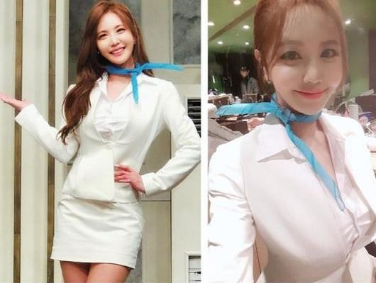 공개한 사진 속 강예빈은 스튜어디스 복장을 하고 포즈를 취하고 있다. 화이트 톤의 승무원 유니폼에 파란색 스카프를 두른 강예빈은 완벽하게 스튜어디스로 변신한 모습이다.
