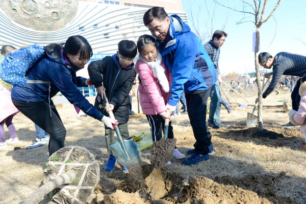 인천 연수구는 지난 17일 선학별빛도서관 앞 선학근린공원에서 주민 300여명이 참여한 가운데 '우리가족 숲 가꾸기 행사'를 진행했다. 사진은 고남석 구청장(오른쪽) 및 참여자들이 나무를 심고 있는 모습. (사진제공=연수구청)