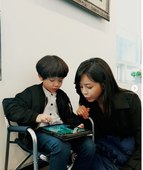 공개한 사진 속 이영아는 아역배우와 함께 전자기기를 보며 다정한 분위기를 자아내고 있다.