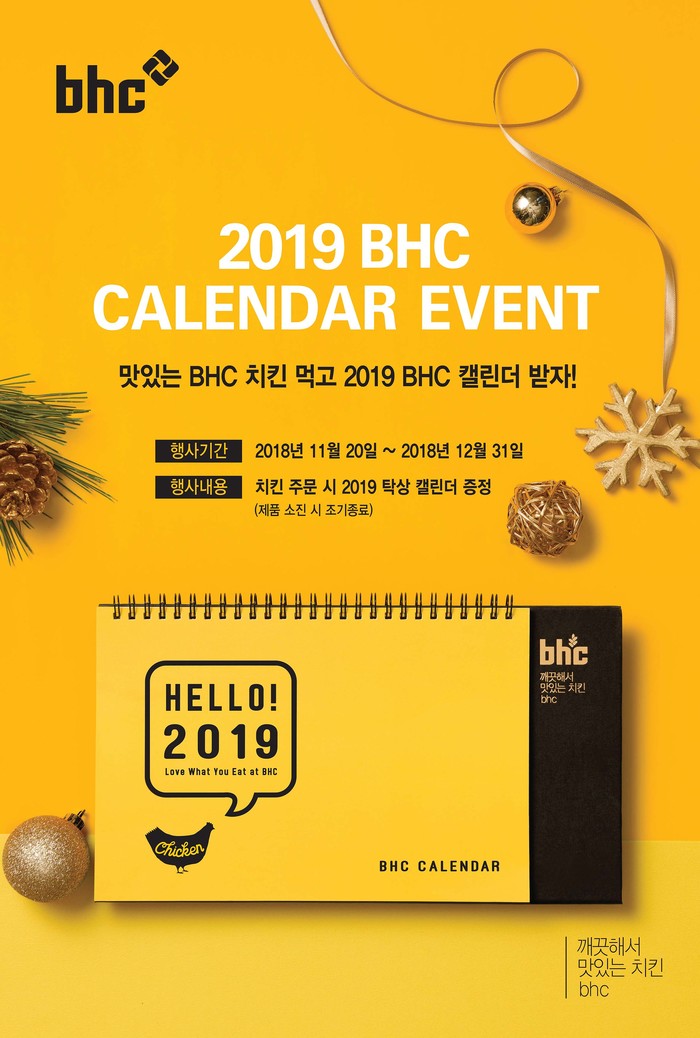 bhc치킨은 올 한 해에도 bhc치킨에 보내준 고객 사랑에 감사의 마음을 전하고 황금돼지해인 내년에도 좋은 일만 가득하기를 기원하기 위해 2019년 bhc 캘린더 이벤트를 기획했다.