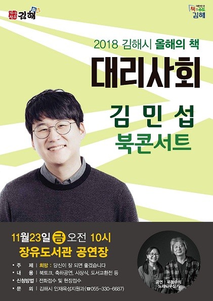 김해시는 오는 23일 오전 10시 장유도서관 공연장에서 2018 김해시 올해의 책 ‘대리사회’의 저자 김민섭 작가를 초청해 북콘서트를 개최한다.
