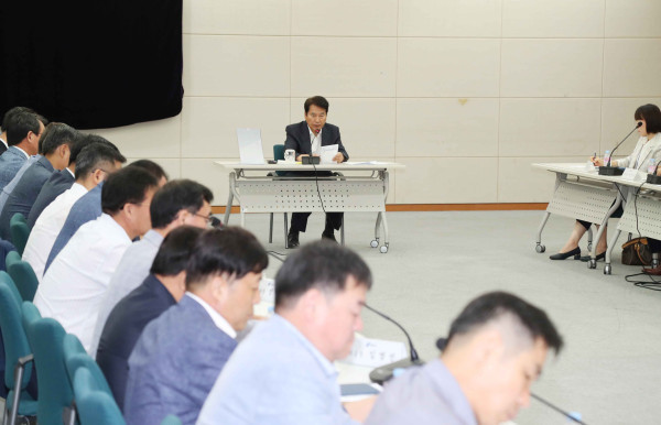 백군기 경기 용인시장은 19일 용인시청 비전홀에서 지역상황 관리자 회의를 주재하면서 읍·면·동장들에게 시민들의 소리에 귀를 기울여달라고 당부했다. 사진은 백 시장이 발언하고 있는 모습. (사진제공=용인시청)